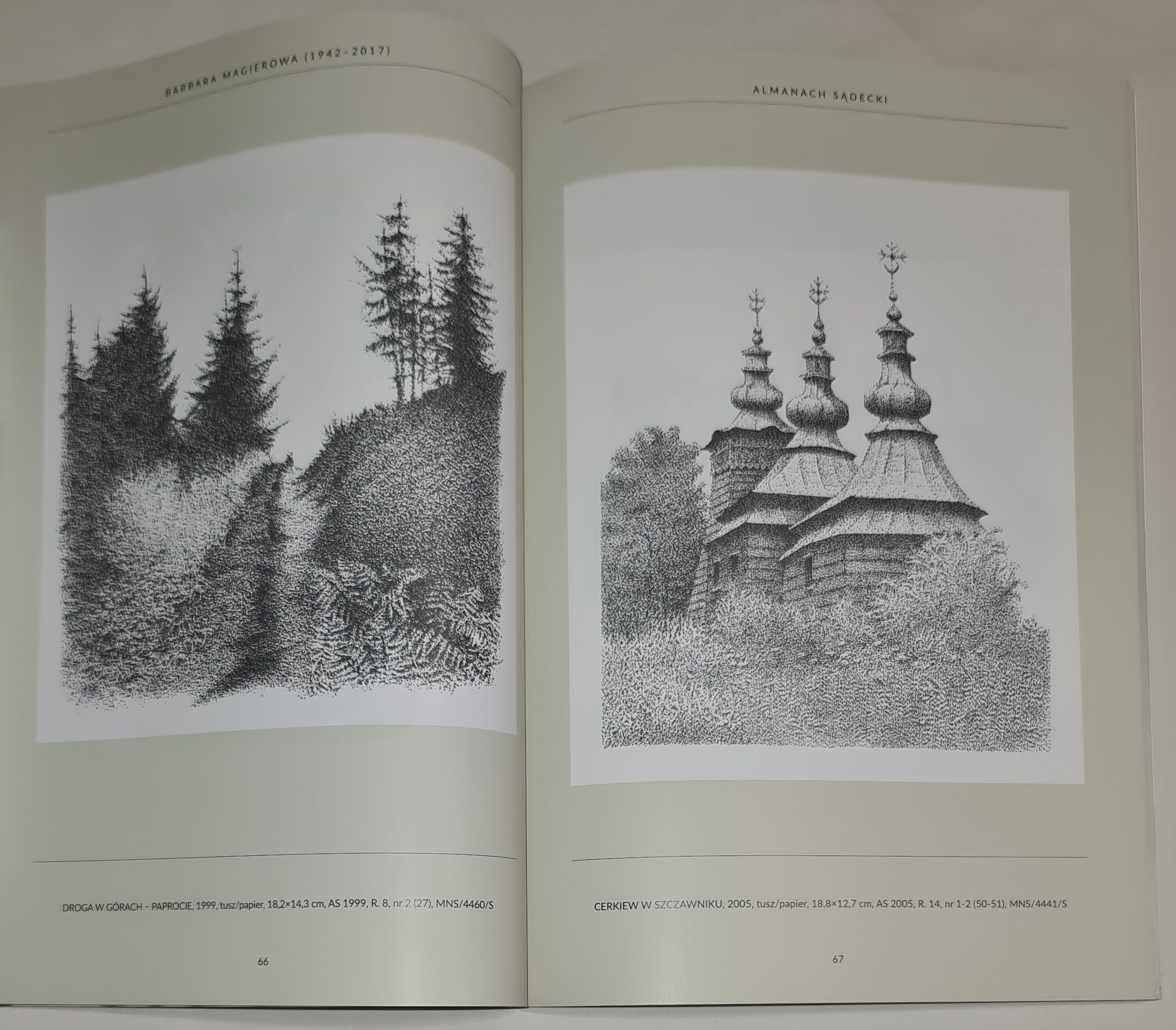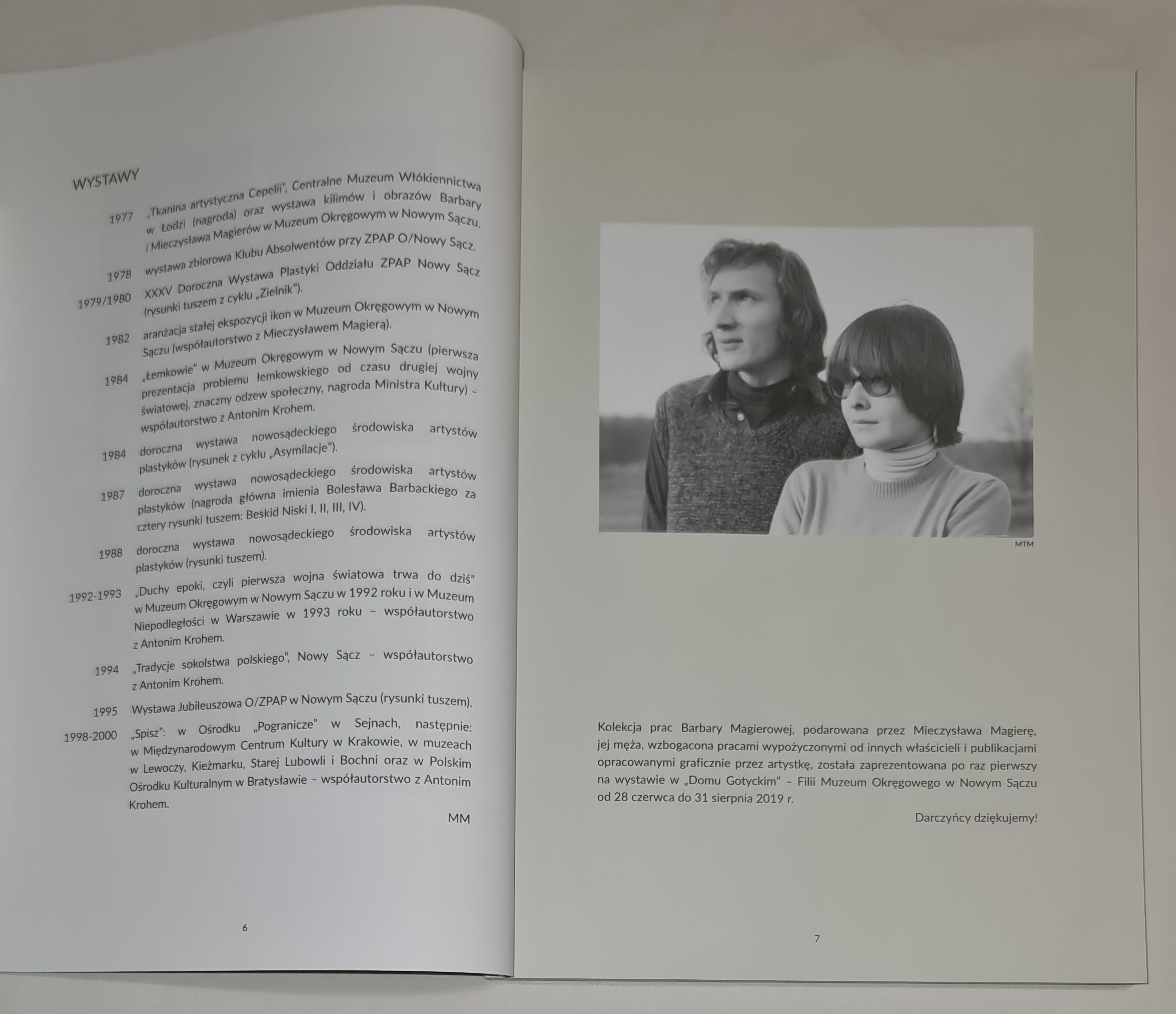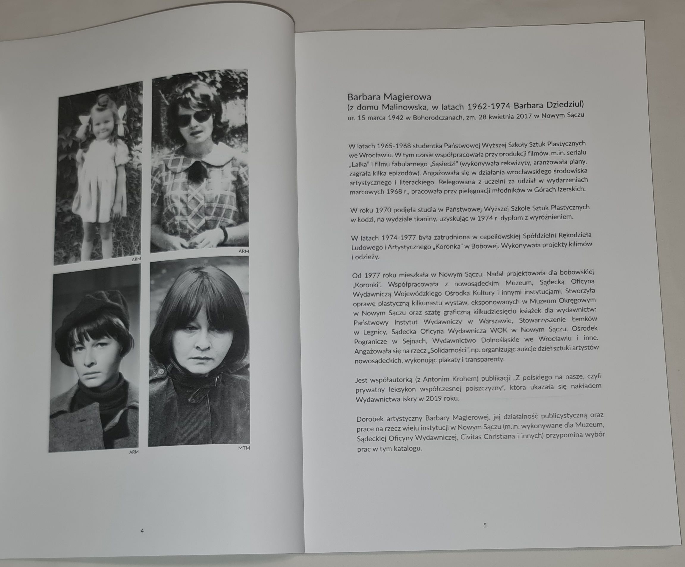 Dorobek artystyczny Barbary Magierowej, jej działalność publicystyczną oraz prace na rzecz wielu instytucji w Nowym Sączu (m.in. wykonywane dla Muzeum, Sądeckiej Oficyny Wydawniczej, Civitas Christiana i innych) przypomina wybór prac w tym katalogu.