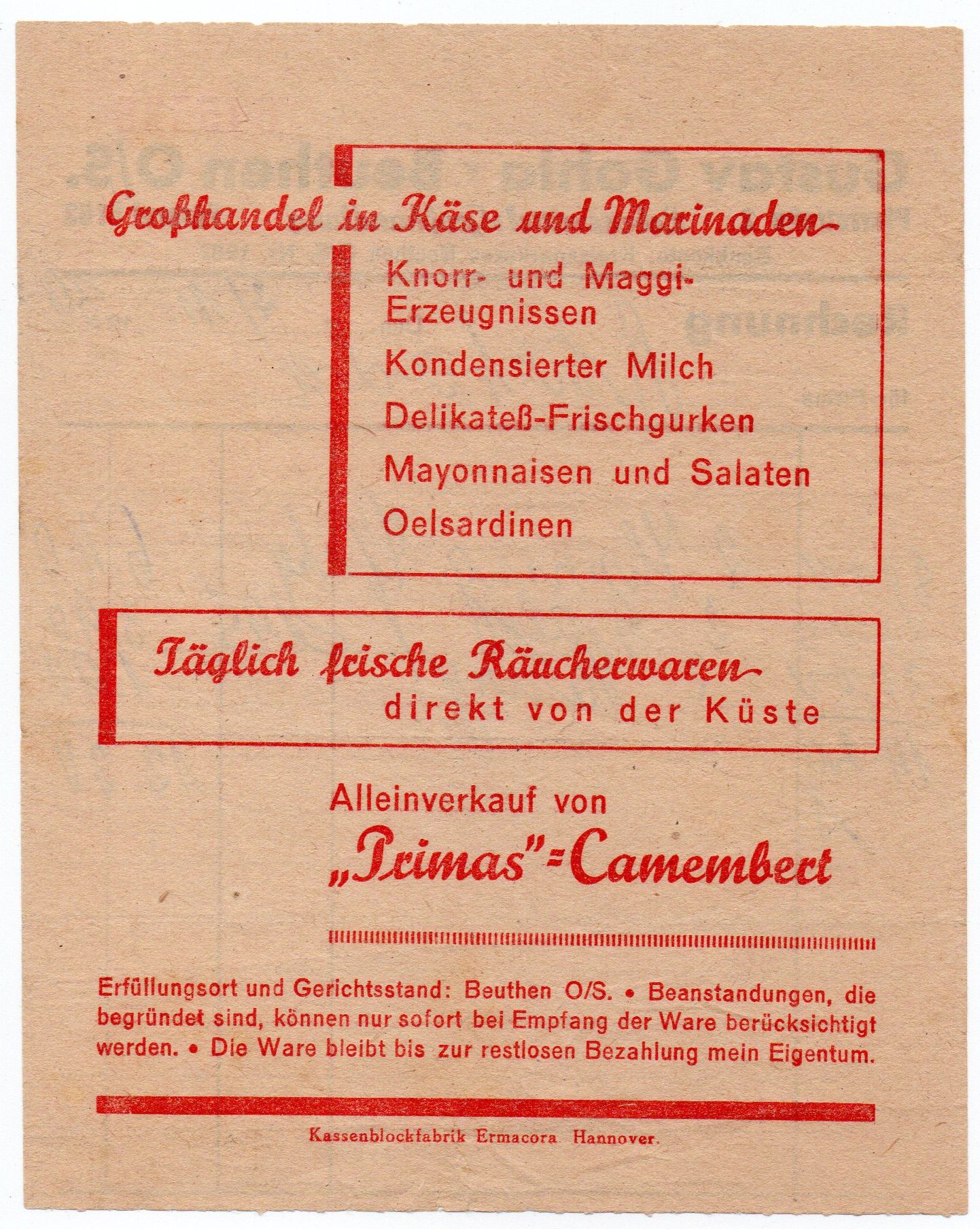 Stary dokument firmowy z Bytomia na Górnym Śląsku (wtedy Beuthen O. S.) z 1939 r. z reklamą asortymentu.