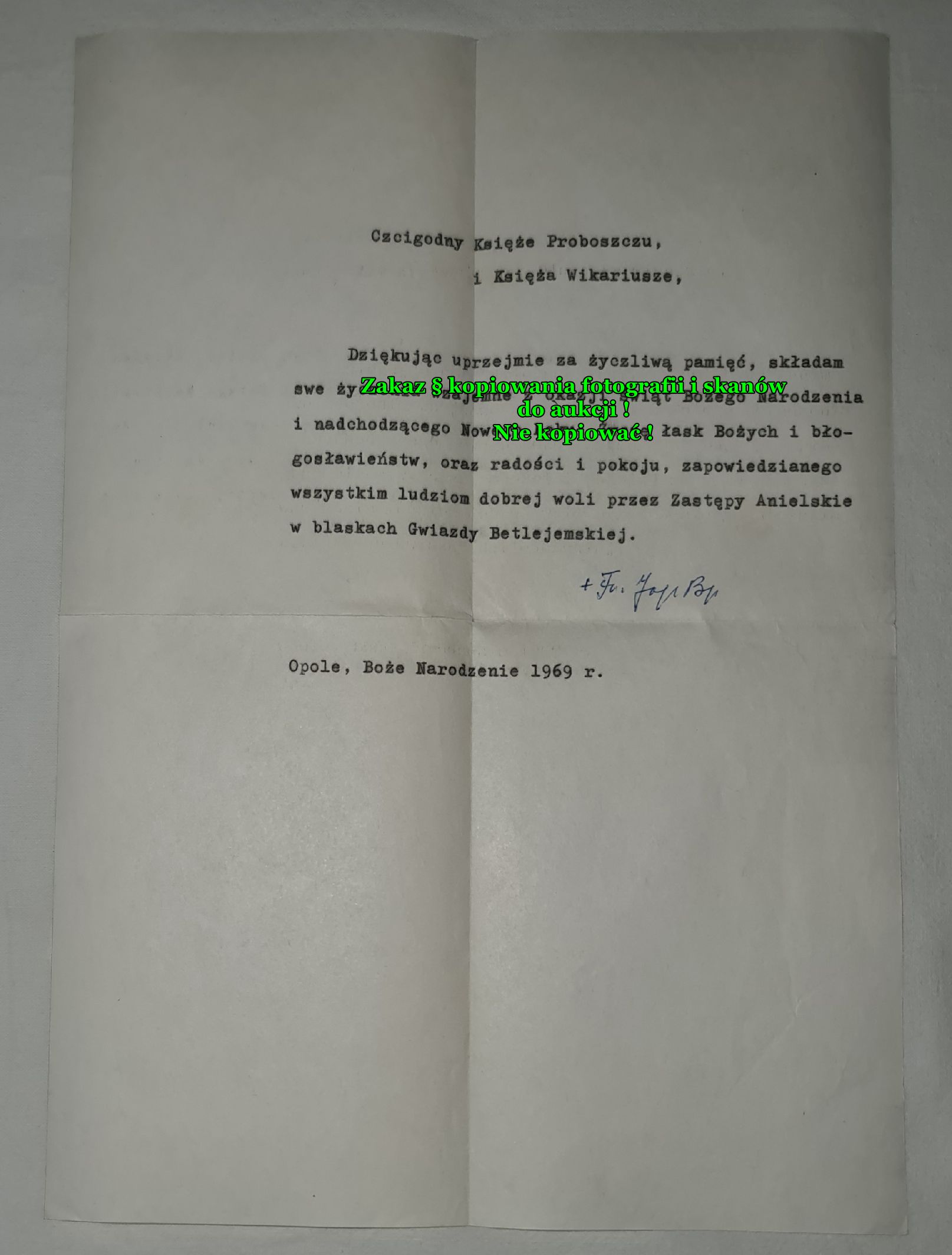 Tags: | 1969, autograf, biskup, Boże Narodzenie, bp, dokument, Franciszej Jop, Górny Śląsk, kościół, list, Opole, PRL, religia, Śląsk, stare dokumenty, zyczenia |