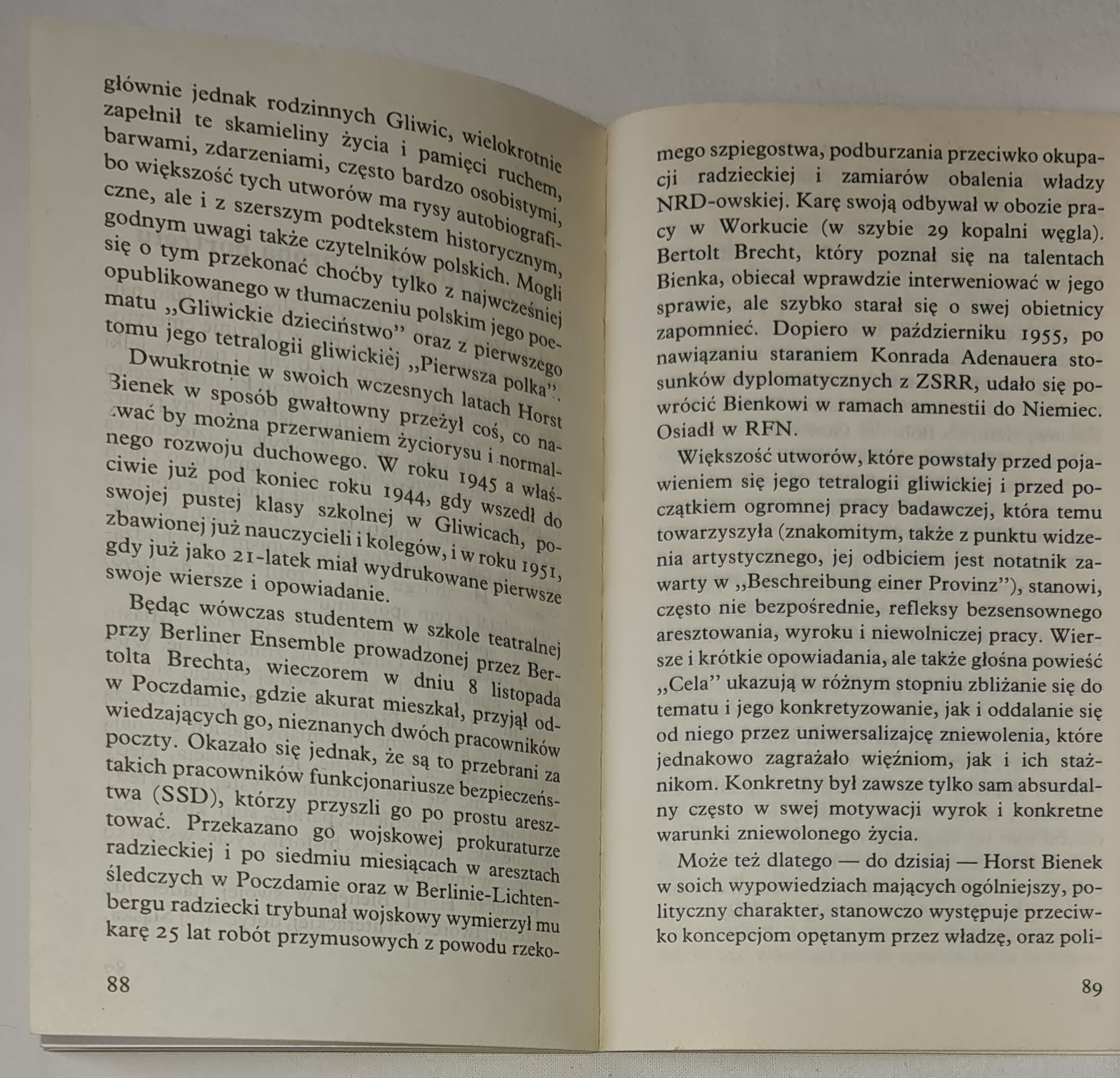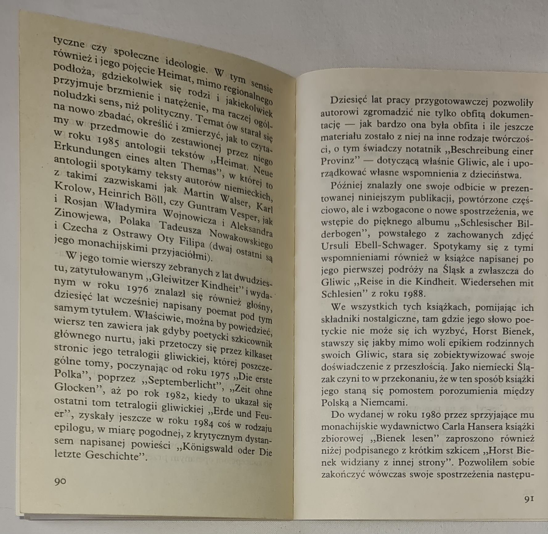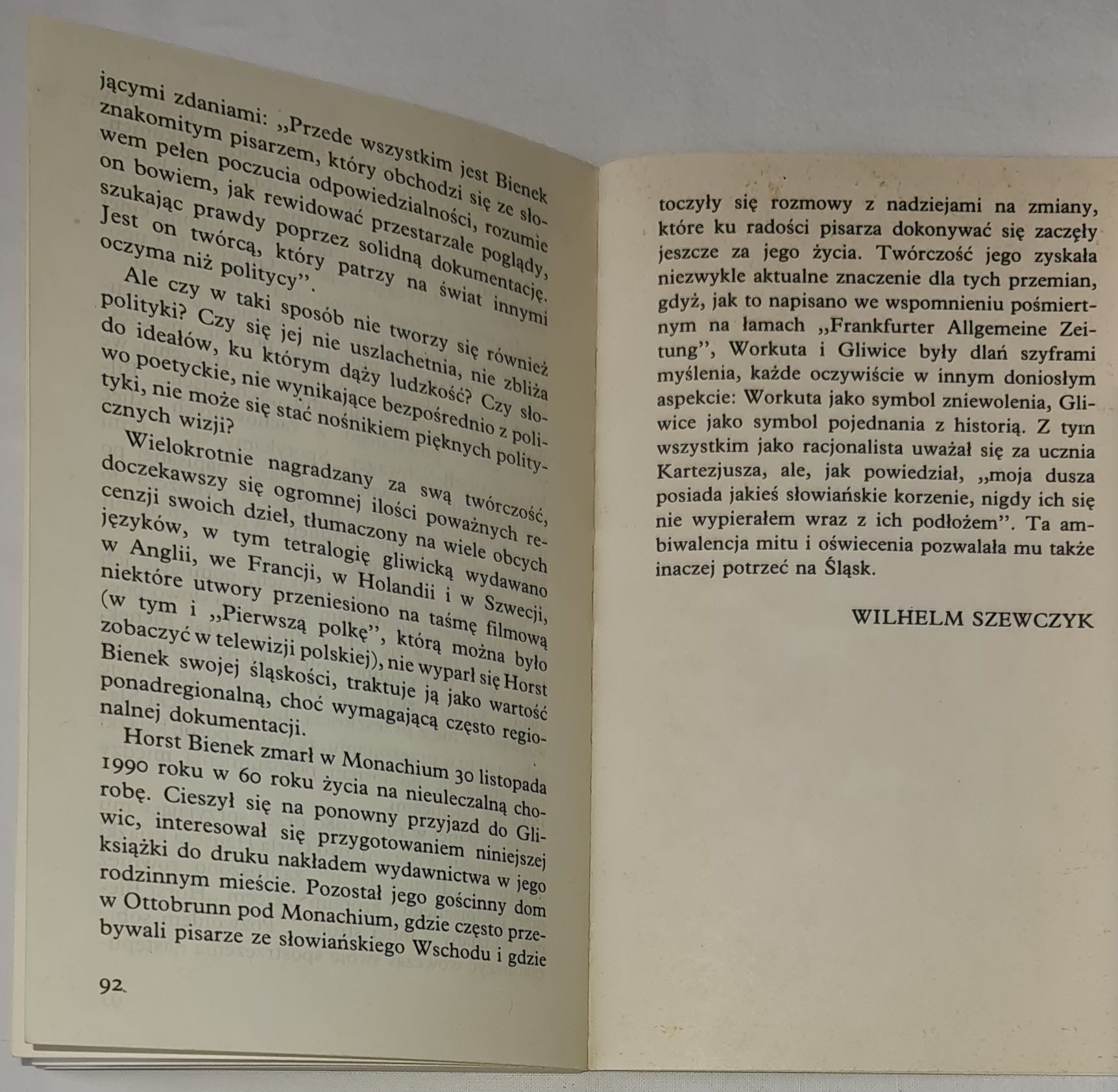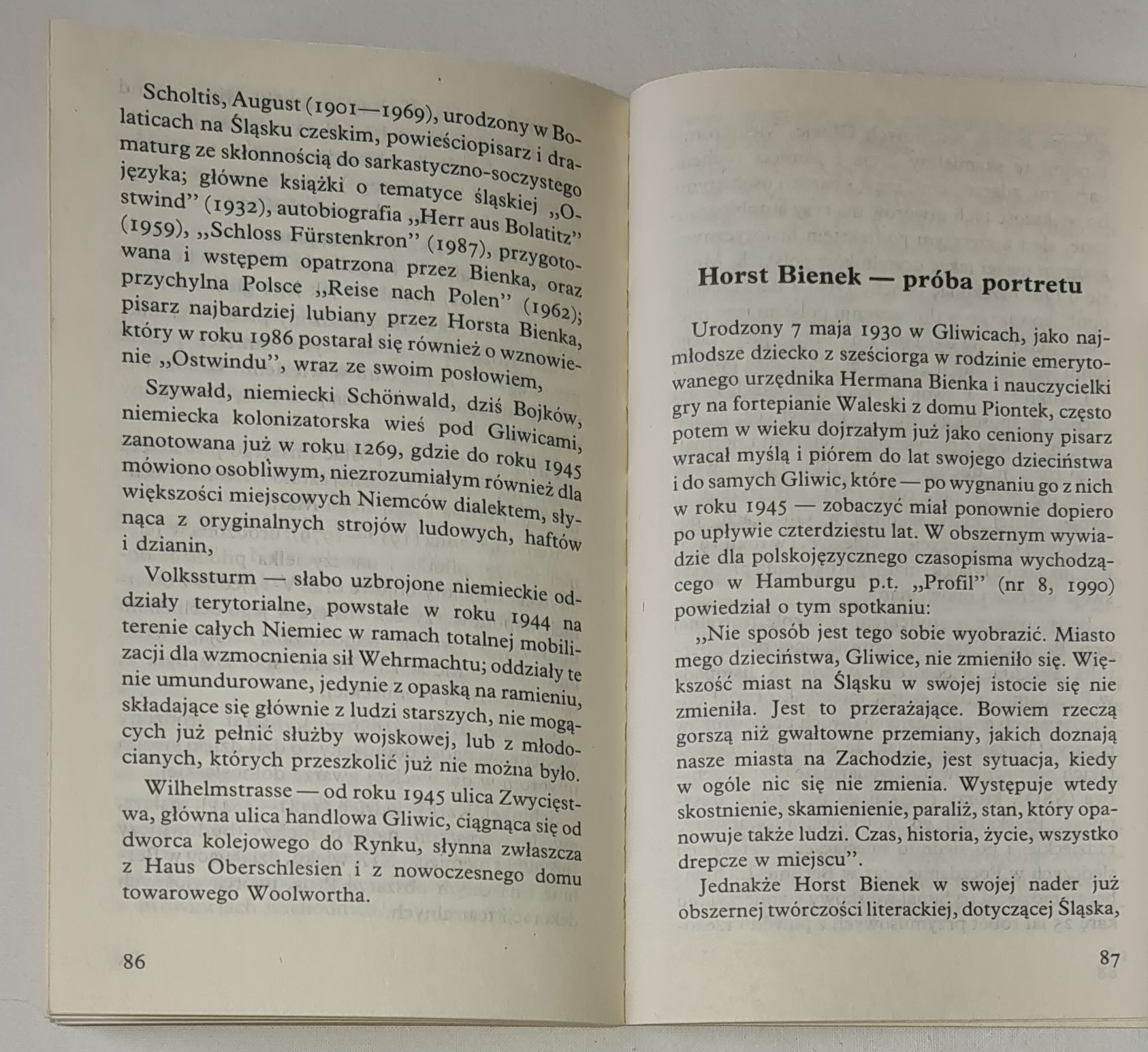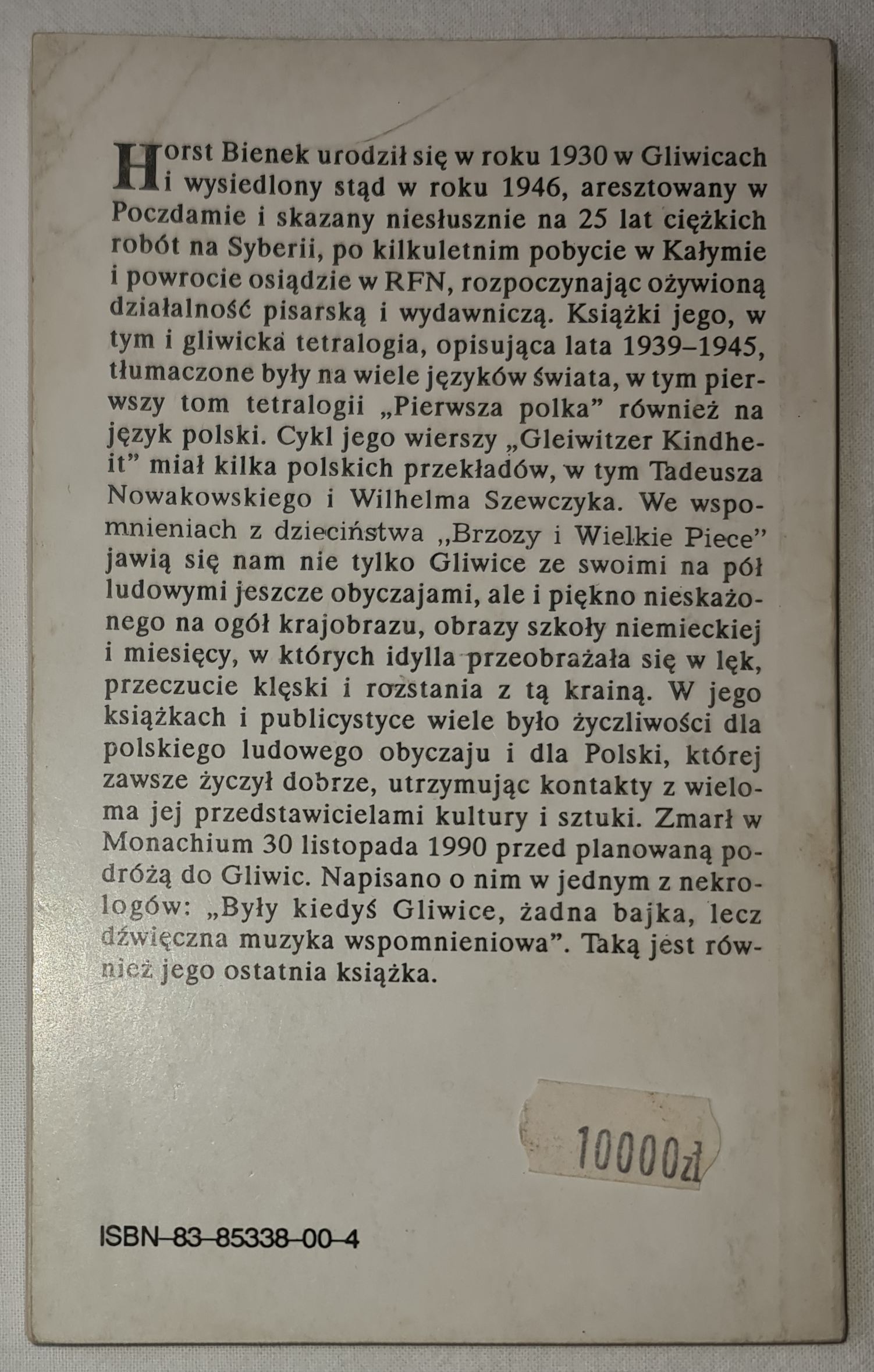 Horst Bienek urodził się w roku 1930 w Gliwicach i wysiedlony stąd w roku 1946, aresztowany w Poczdamie i skazany niesłusznie na 25 lat ciężkich robót na Syberii, po kilkuletnim pobycie w Kałymie i powrocie osiądzie w RFN, rozpoczynając ożywioną działalność pisarską i wydawniczą. Książki jego, w tym i gliwicka tetralogia, opisująca lata 1939-1945, tłumaczone były na wiele języków świata, w tym pierwszy tom tetralogii „Pierwsza polka” również na język polski. Cykl jego wierszy „Gleiwitzer Kindheit” miał kilka polskich przekładów, w tym Tadeusza Nowakowskiego i Wilhelma Szewczyka. We wspomnieniach z dzieciństwa „Brzozy i Wielkie Piece” jawią się nam nie tylko Gliwice ze swoimi na pół ludowymi jeszcze obyczajami, ale i piękno nieskażonego na ogół krajobrazu, obrazy szkoły niemieckiej i miesięcy, w których idylla przeobrażała się w lęk, przeczucie klęski i rozstania z tą krainą. W jego książkach i publicystyce wiele było życzliwości dla polskiego ludowego obyczaju i dla Polski, której zawsze życzył dobrze, utrzymując kontakty z wieloma jej przedstawicielami kultury i sztuki. Zmarł w Monachium 30 listopada 1990 przed planowaną podróżą do Gliwic. Napisano o nim w jednym z nekrologów: „Były kiedyś Gliwice, żadna bajka, lecz dźwięczna muzyka wspomnieniowa”. Taką jest również jego ostatnia książka.