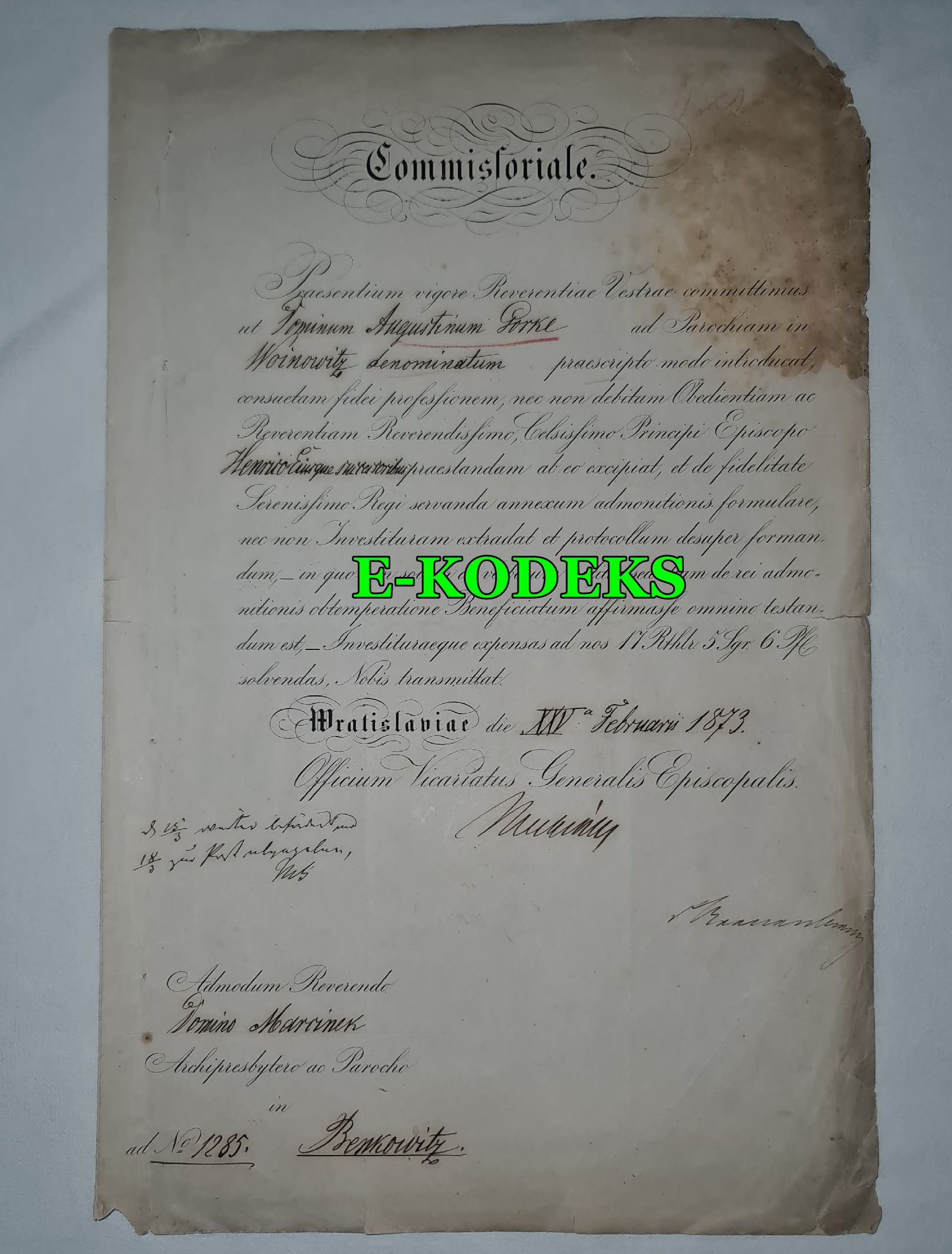 Commissoriale Wrocław Kuria Biskupia XIX w., autograf, Parafia Wojnowice, Bieńkowice pow. Racibórz Woinowitz Bienkowitz