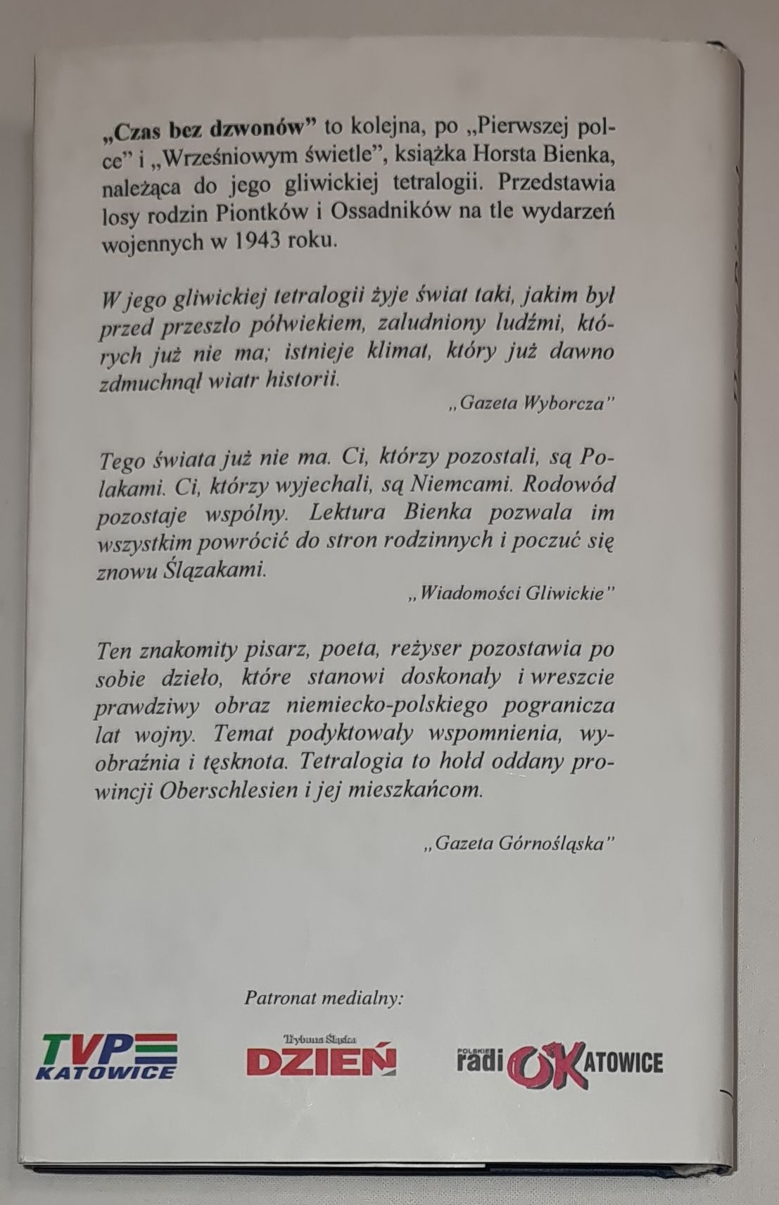 „Czas bez dzwonów” to kolejna, po „Pierwszej polce” i „Wrześniowym świetle”, książka Horsta Bienka, należąca do jego gliwickiej tetralogii. Przedstawia losy rodzin Piontków i Ossadników na tle wydarzeń wojennych w 1943 roku.