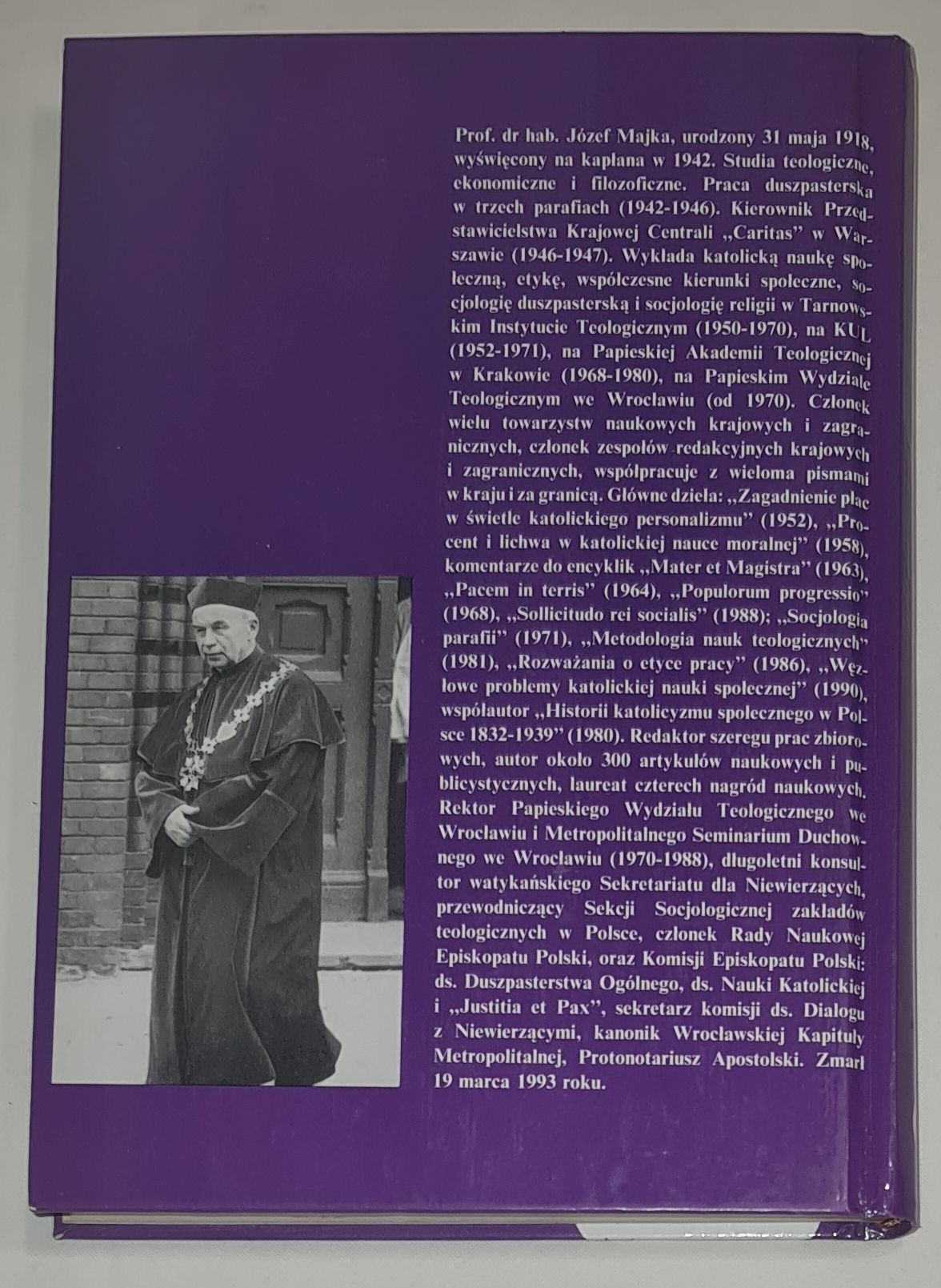 Prof. dr hab. Józef Majka, urodzony 31 maja 1918, wyświęcony na kapłana w 1942. Studia teologiczne, ekonomiczne i filozoficzne. Praca duszpasterska w trzech parafiach (1942-1946). Kierownik Przedstawicielstwa Krajowej Centrali „Caritas” w Warszawie (1946-1947). Wykłada katolicką naukę społeczną, etykę, współczesne kierunki społeczne, socjologię duszpasterską i socjologię religii w Tarnowskim Instytucie Teologicznym (1950-1970), na KUL (1952-1971), na Papieskiej Akademii Teologicznej w Krakowie (1968-1980), na Papieskim Wydziale Teologicznym we Wrocławiu (od 1970). Członek wielu towarzystw naukowych krajowych i zagranicznych, członek zespołów redakcyjnych krajowych i zagranicznych, współpracuje z wieloma pismami w kraju i za granicą. Główne dzieła: „Zagadnienie płac w świetle katolickiego personalizmu” (1952), „Procent i lichwa w katolickiej nauce moralnej” (1958), komentarze do encyklik „Mater et Magistra” (1963), „Pacem in terris” (1964), „Populorum progressio” (1968), „Sollicitudo rei socialis” (1988); „Socjologia parafii” (1971), „Metodologia nauk teologicznych” (1981), „Rozważania o etyce pracy” (1986), „Węzłowe problemy katolickiej nauki społecznej” (1990), współautor „Historii katolicyzmu społecznego w Polsce 1832-1939” (1980). Redaktor szeregu prac zbiorowych, autor około 300 artykułów naukowych i publicystycznych, laureat czterech nagród naukowych. Rektor Papieskiego Wydziału Teologicznego we Wrocławiu i Metropolitarnego Seminarium Duchownego we Wrocławiu (1970-1988), długoletni konsultor watykańskiego Sekretariatu dla Niewierzących, przewodniczący Sekcji Socjologicznej zakładów teologicznych w Polsce, członek Rady Naukowej Episkopatu Polski, oraz Komisji Episkopatu Polski ds. Duszpasterstwa Ogólnego, ds. Nauki Katolickiej i „Justitia et Pax”, sekretarz komisji ds. Dialogu z Niewierzącymi, kanonik Wrocławskiej Kapituły Metropolitalnej. Protonotariusz Apostolski. Zmarł 19 marca 1993 roku.