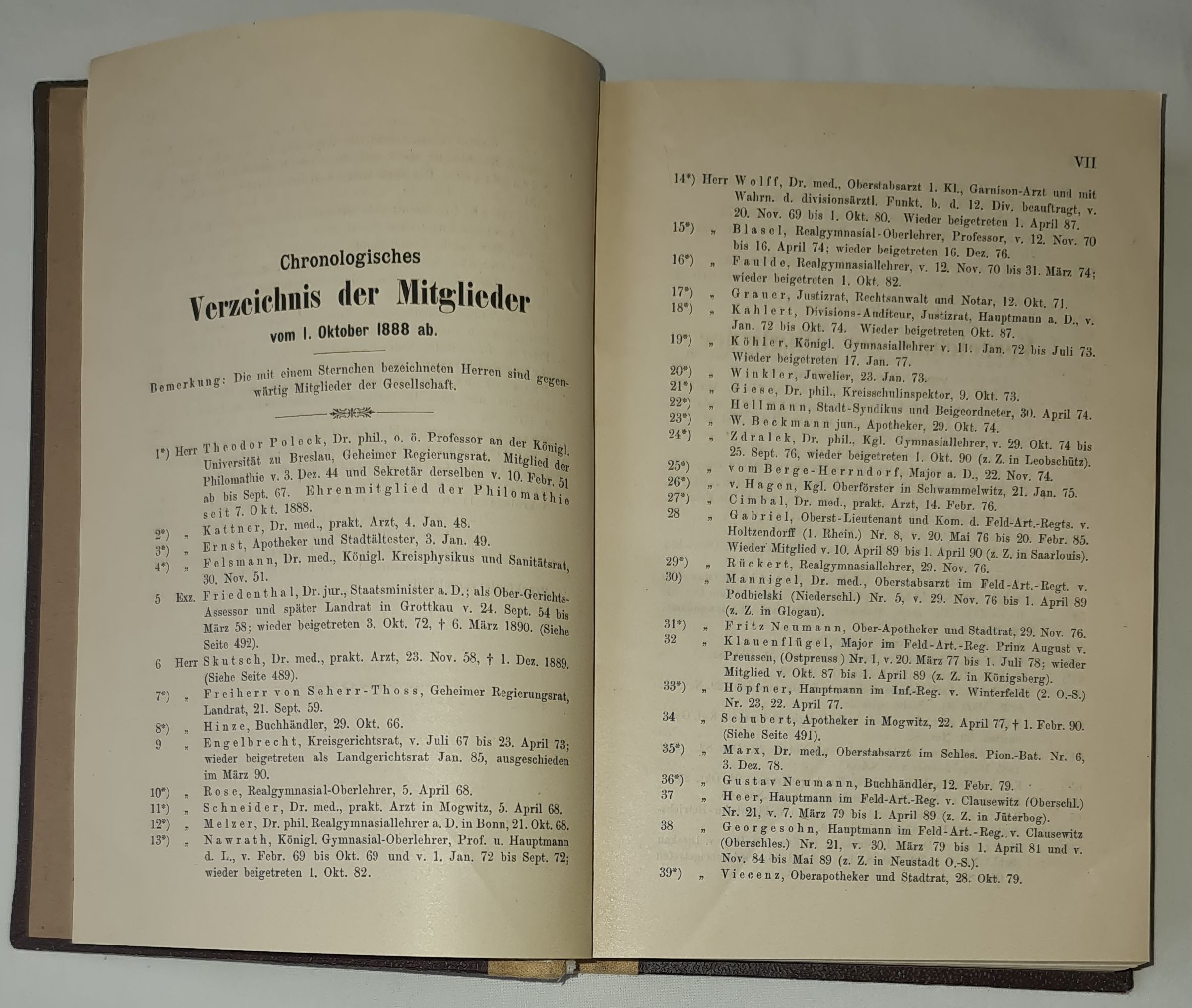25 Sprawozdanie Towarzystwa Naukowego Filomatów w Nysie, za okres od października 1888 do października 1890 zawiera chronologiczny spis członków towarzystwa od 1 października 1888 r. (wyjątek stanowią osoby, które zmarły w okresie sprawozdawczym, a których nekrologi zamieszczono w tym wolumenie), oraz aktualny skład zarządu (1890 r.). W dalszej części zamieszczono spis stowarzyszeń współpracujących z Filomatami, które nadesłały swoje publikacje do biblioteki towarzystwa w okresie od 1 października 1888 r. do 1 października 1890 r.