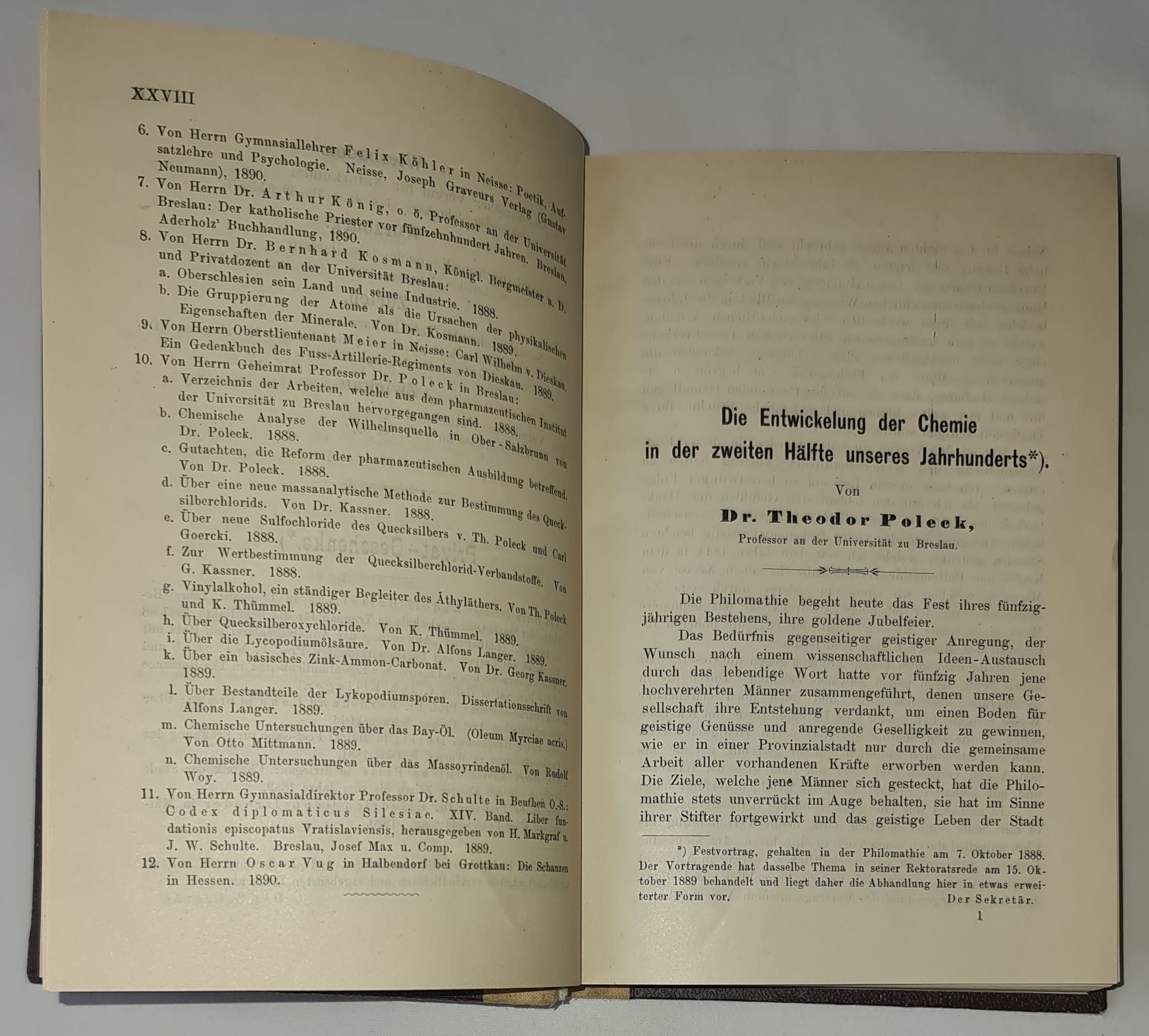 1. Dr Theodor Poleck (Profesor Królewskiego Uniwersytetu we Wrocławiu) omówił rozwój chemii w drugiej połowie XIX stulecia