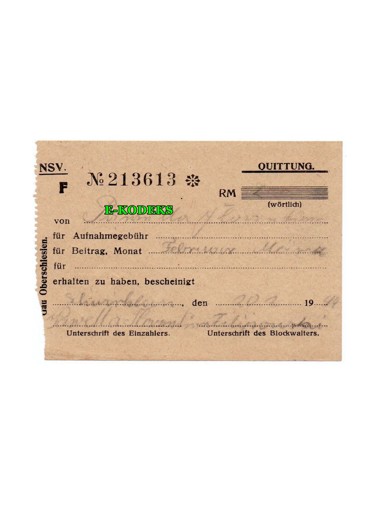 Jest to numerowany dokument imienny QUITTUNG (POKWITOWANIE) na druku okupacyjnym z Górnego Śląska (Gau Oberschlesien). Dokument potwierdzający wpłatę na NSV – Nationalsozialistische Volkswohlfahrt (Narodowosocjalistyczna Ludowa Opieka Społeczna)