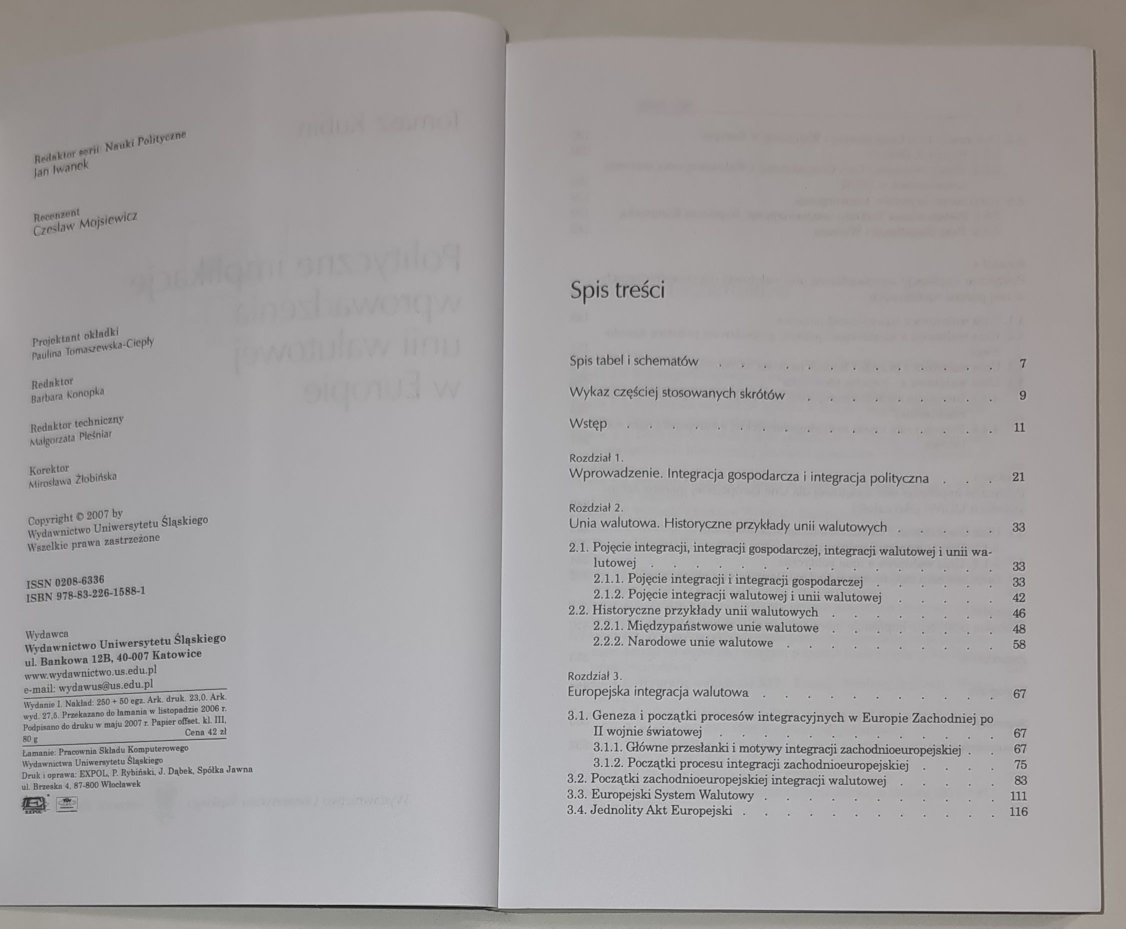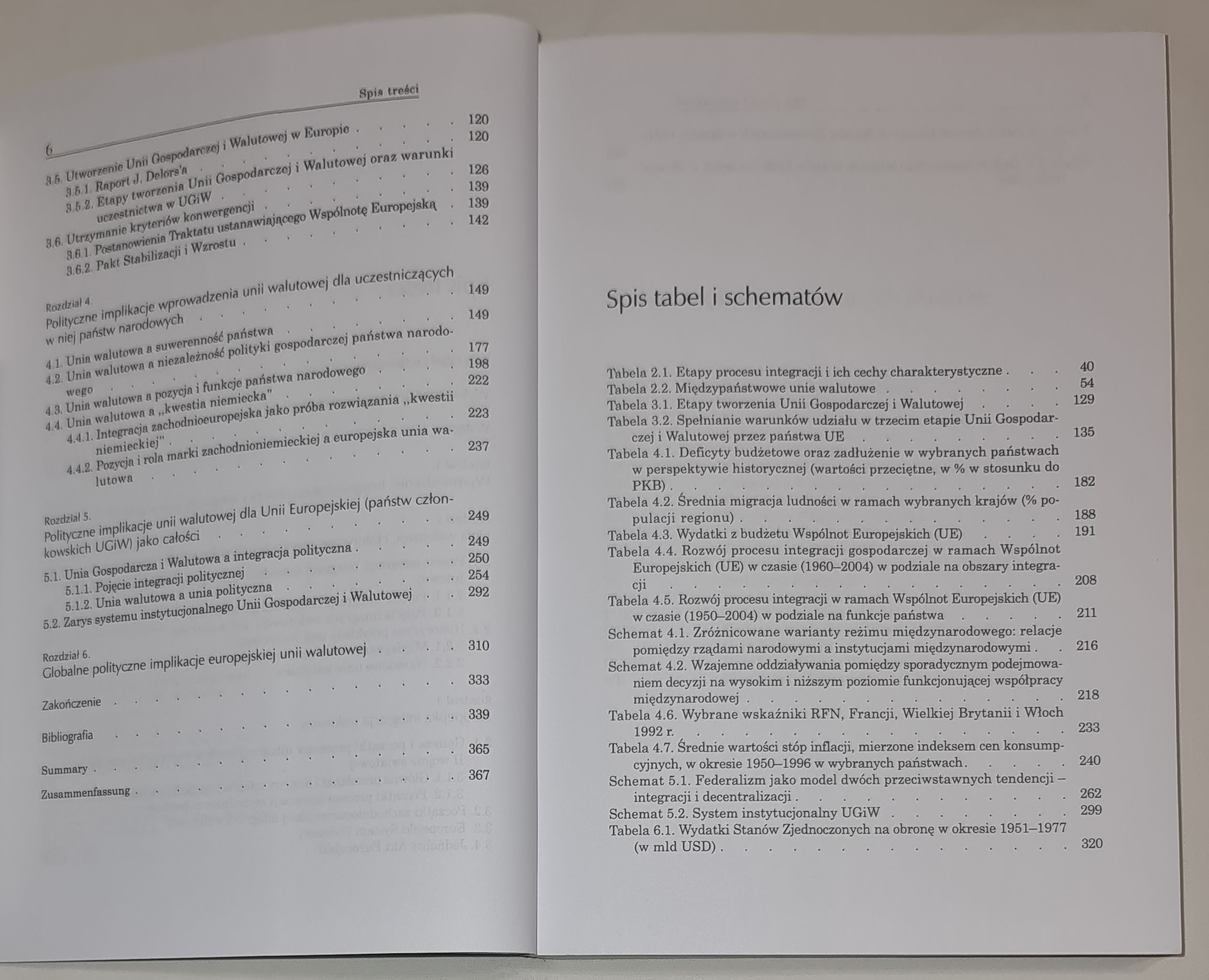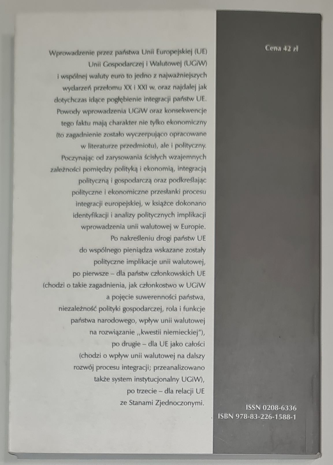 Autor – opierając się na bardzo szeroko przytaczanej literaturze krajowej i zagranicznej – zarysowuje zależności między polityką i ekonomią, integracją polityczną i gospodarczą oraz dokonuje identyfikacji i analizy politycznych implikacji wprowadzenia unii walutowej w Europie. Nakreśla drogę państw do wspólnego pieniądza oraz wskazuje na skutki tego przedsięwzięcia dla państw członkowskich UE (chodzi o zagadnienie członkostwa w unii walutowej w kontekście suwerenności danego państwa czy niezależności jego polityki gospodarczej) i dla UE jako całości (wpływ unii walutowej na rozwój procesu integracji), dla relacji UE ze Stanami Zjednoczonymi.