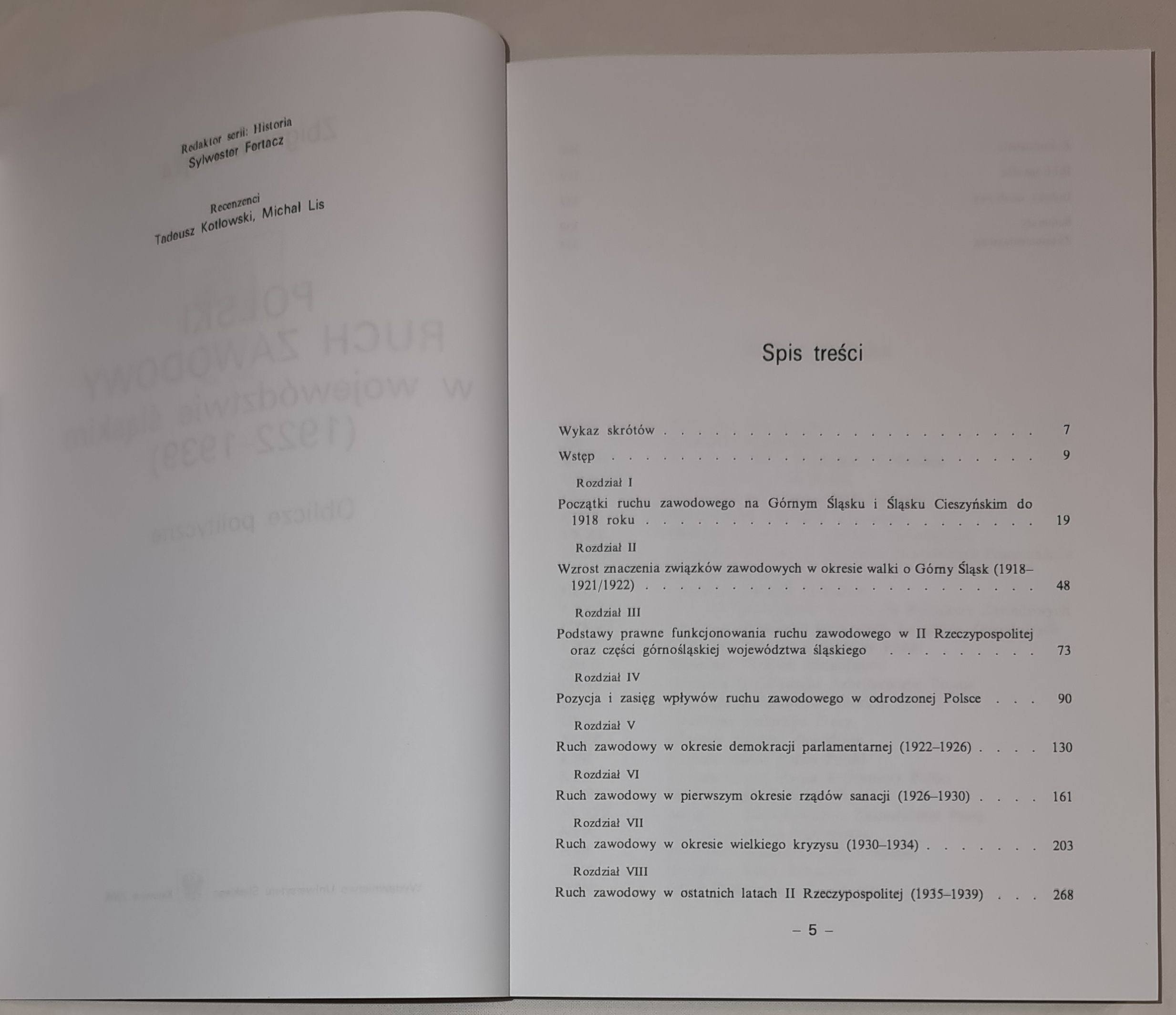 W ośmiu rozdziałach Autor wnikliwie analizuje takie problemy, jak początki ruchu zawodowego na Górnym Śląsku i Śląsku Cieszyńskim, wzrost znaczenia związków zawodowych w okresie walki o Górny Śląsk (1918-1921/1922), podstawy prawne funkcjonowania związków, pozycja i zasięg ruchu zawodowego w odrodzonej Polsce, ruch zawodowy w okresie demokracji parlamentarnej (1922-1926), w pierwszym okresie rządów sanacji (1926-1930), w okresie wielkiego kryzysu (1930-1934) oraz w ostatnich latach II Rzeczypospolitej (1935-1939).