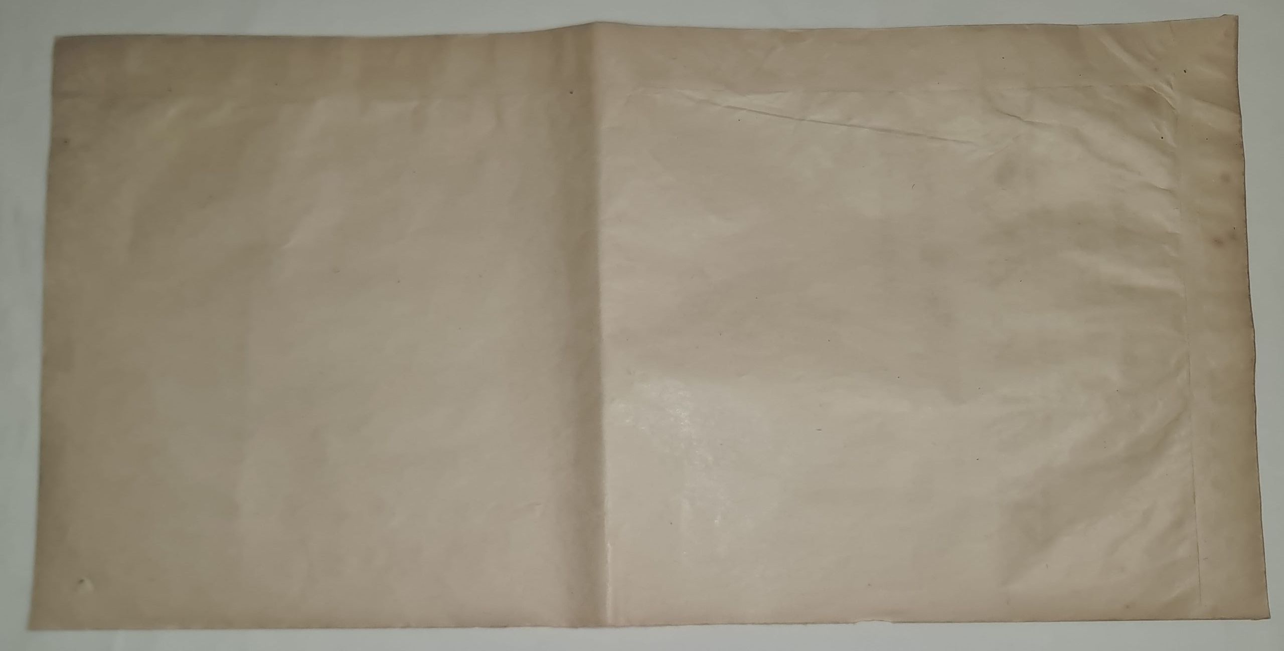 Reklamowa torba papierowa (nieużywana) przetrwała wojnę i obecnie jest w stanie jak na fot. (drobne po latach zaplamienia, na jednym z długich boków w miejscu zagięcia papieru przedarcie na znacznej długości – co pokazano na dodatkowej fot., oraz m. in. u góry dziura do powieszenia na gwoździu, złożenie torby w połowie).