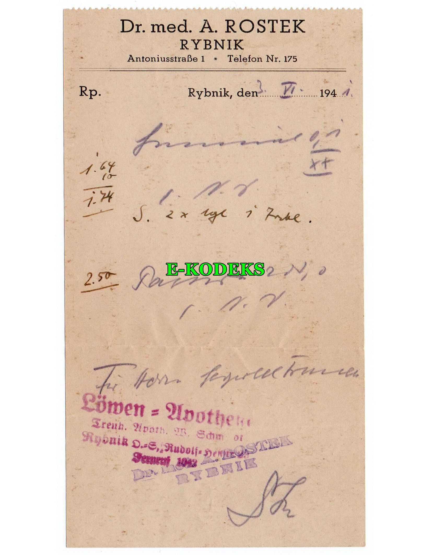 Rybnik lekarz Augustyn Rostek Autograf 1941 Recepta Apteka