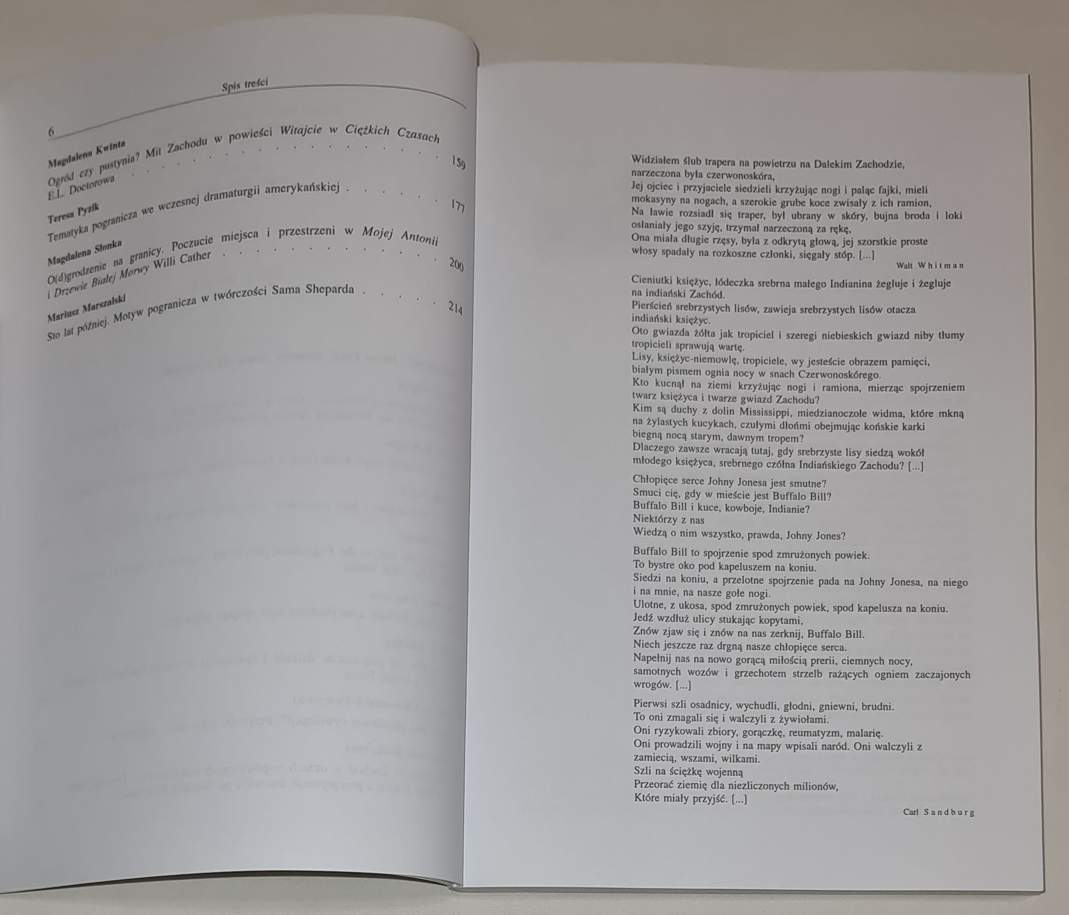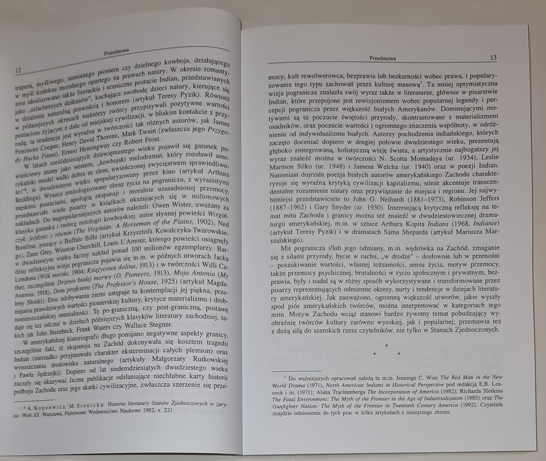 Natomiast dojrzała poezja białych autorów amerykańskiego Zachodu charakteryzuje się wyraźną krytyką cywilizacji kapitalizmu, silnie akcentuje transcendentalne rozumienie natury oraz przywiązanie do miejsca i regionu. Jej najwybitniejsi przedstawiciele to John G. Neihardt (1881-1973), Robinson Jeffers (1887-1962) i Gary Snyder (ur. 1930). Interesującą krytyczną refleksję na temat mitu Zachodu i granicy można też znaleźć w dwudziestowiecznej dramaturgii amerykańskiej, m.in. w sztuce Arthura Kopita Indians (1968, Indianie) (artykuł Teresy Pyzik) i w dramatach Sama Sheparda (artykuł Mariusza Marszalskiego). Mit pogranicza i/lub jego odmiany, m.in. wędrówka na Zachód, zmaganie się z siłami przyrody, bycie w ruchu, „w drodze” – dosłownie lub w przenośni – poszukiwanie wartości, własnej tożsamości, sensu życia, motyw przemocy, także przemocy psychicznej, brutalności w życiu społecznym i prywatnym, bezprawia, były i nadal są w różny sposób wykorzystywane i transformowane przez pisarzy reprezentujących odmienne okresy, nurty i tendencje w dziejach literatury amerykańskiej. Jak zauważono, ogromną większość utworów, jakie wyszły spod piór amerykańskich twórców, można interpretować w kategoriach tego mitu. Motyw Zachodu wciąż stanowi bardzo żywotny temat pobudzający wyobraźnię twórców kultury zarówno wysokiej, jak i popularnej; przemawia też z dużą siłą do szerokich rzesz czytelników, nie tylko w Stanach Zjednoczonych.