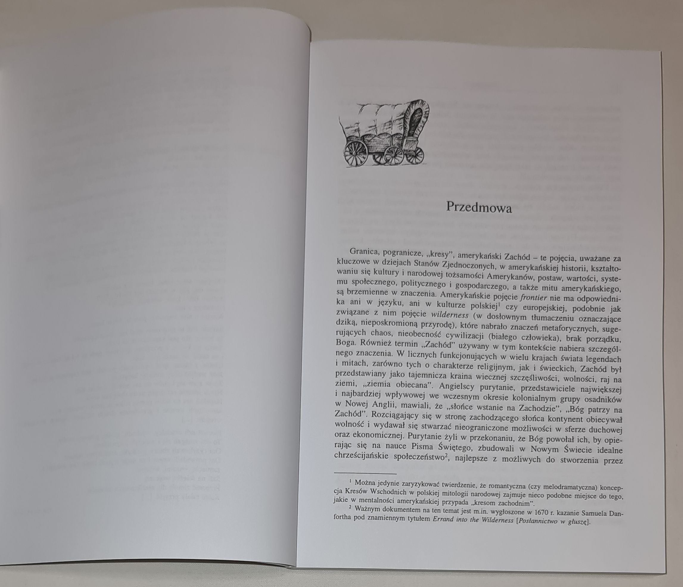 Granica, pogranicze, „kresy”, amerykański Zachód – te pojęcia, uważane za kluczowe w dziejach Stanów Zjednoczonych, w amerykańskiej historii, kształtowaniu się kultury i narodowej tożsamości Amerykanów, postaw, wartości, systemu społecznego, politycznego i gospodarczego, a także mitu amerykańskiego, są brzemienne w znaczenia. Amerykańskie pojęcie frontier nie ma odpowiednika ani w języku, ani w kulturze polskiej czy europejskiej, podobnie jak związane z nim pojęcie wilderness (w dosłownym tłumaczeniu oznaczające dziką, nieposkromioną przyrodę), które nabrało znaczeń metaforycznych, sugerujących chaos, nieobecność cywilizacji (białego człowieka), brak porządku, Boga. Również termin „Zachód” używany w tym kontekście nabiera szczególnego znaczenia. W licznych funkcjonujących w wielu krajach świata legendach i mitach, zarówno tych o charakterze religijnym, jak i świeckich, Zachód był przedstawiany jako tajemnicza kraina wiecznej szczęśliwości, wolności, raj na ziemi, „ziemia obiecana”. Angielscy purytanie, przedstawiciele największej i najbardziej wpływowej we wczesnym okresie kolonialnym grupy osadników w Nowej Anglii, mawiali, że „słońce wstanie na Zachodzie”, „Bóg patrzy na Zachód”. Rozciągający się w stronę zachodzącego słońca kontynent obiecywał wolność i wydawał się stwarzać nieograniczone możliwości w sferze duchowej oraz ekonomicznej. Purytanie żyli w przekonaniu, że Bóg powołał ich, by opierając się na nauce Pisma Świętego, zbudowali w Nowym Świecie idealne chrześcijańskie społeczeństwo, najlepsze z możliwych do stworzenia przez człowieka, „Nowe Jeruzalem”, „Miasto na Wzgórzu” (City upon the Hill), przyciągające oczy całego świata, by zamienili dziką przyrodę w „boskie plantacje” (God’s Plantations) – koncepcja zsekularyzowana przez późniejszą ideologię amerykańską.