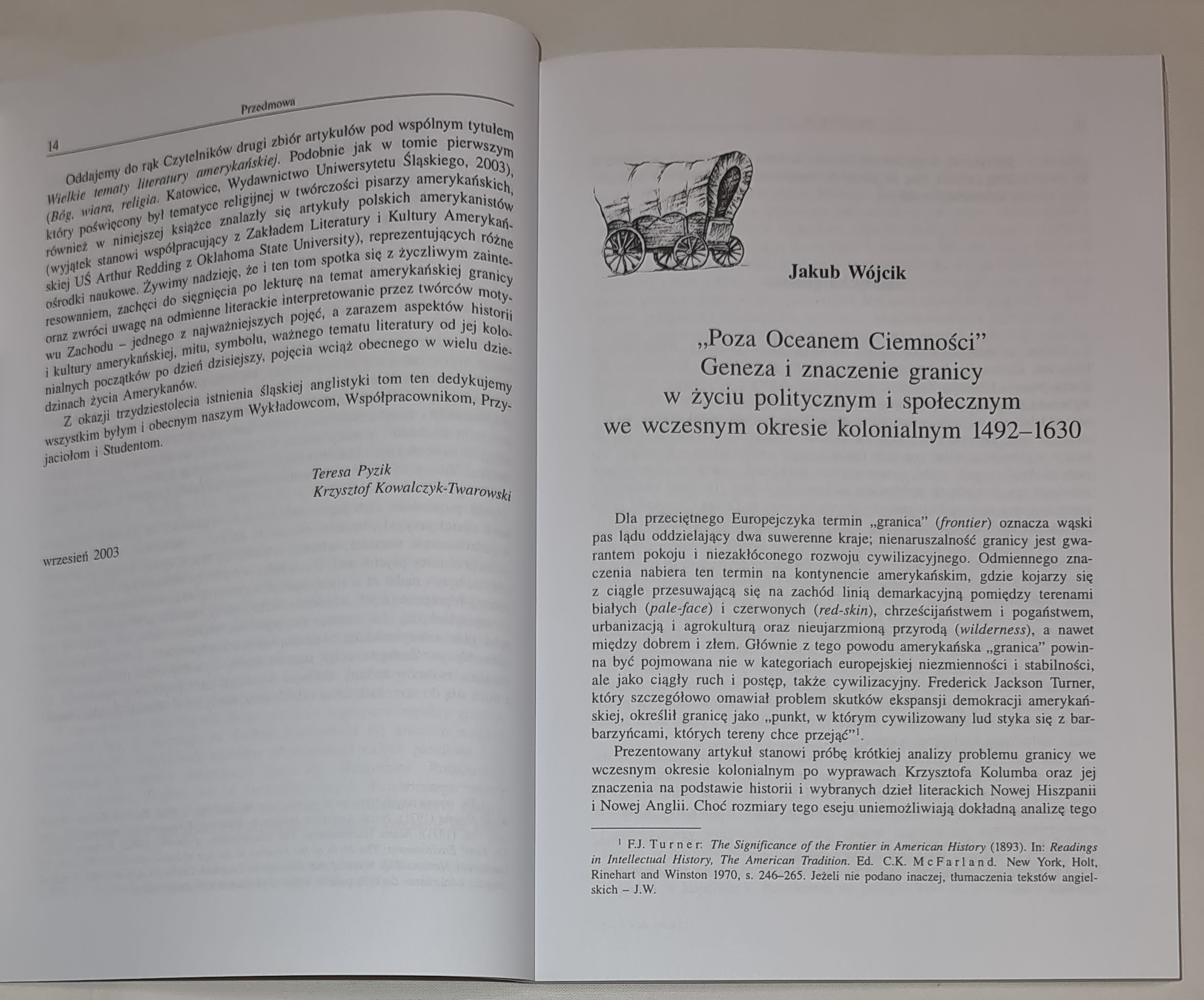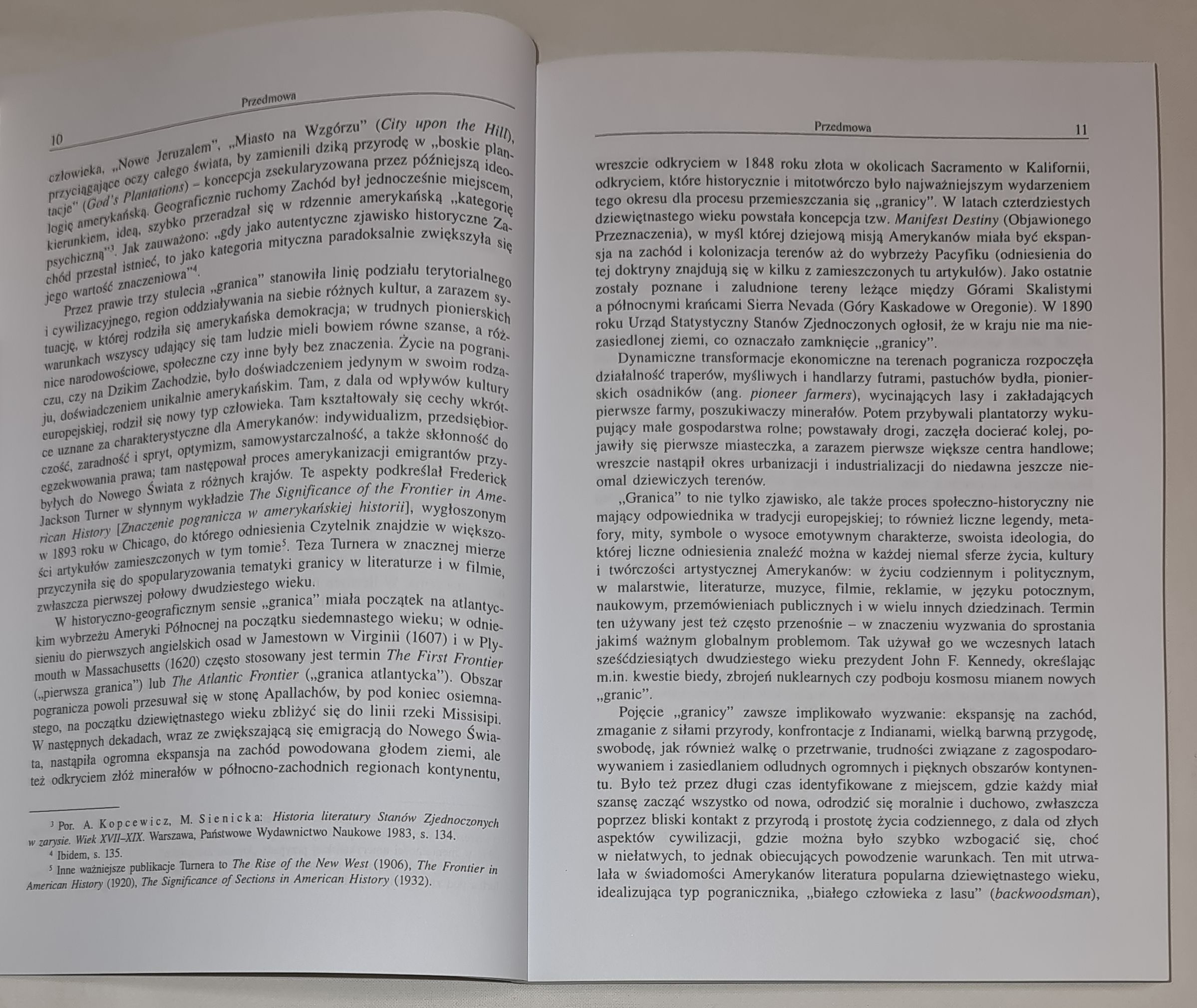 Te aspekty podkreślał Frederick Jackson Turner w słynnym wykładzie The Significance of the Frontier in American History [Znaczenie pogranicza w amerykańskiej historii], wygłoszonym w 1893 roku w Chicago, do którego odniesienia Czytelnik znajdzie w większości artykułów zamieszczonych w tym tomie. Teza Turnera w znacznej mierze przyczyniła się do spopularyzowania tematyki granicy w literaturze i w filmie, zwłaszcza pierwszej połowy dwudziestego wieku. W historyczno-geograficznym sensie „granica” miała początek na atlantyckim wybrzeżu Ameryki Północnej na początku siedemnastego wieku; w odniesieniu do pierwszych angielskich osad w Jamestown w Virginii (1607) i w Plymouth w Massachusetts (1620) często stosowany jest termin The First Frontier („pierwsza granica”) lub The Atlantic Frontier („granica atlantycka”). Obszar pogranicza powoli przesuwał się w stronę Apallachów, by pod koniec osiemnastego, na początku dziewiętnastego wieku zbliżyć się do linii rzeki Missisipi. W następnych dekadach, wraz ze zwiększającą się emigracją do Nowego Świata, nastąpiła ogromna ekspansja na zachód powodowana głodem ziemi, ale też odkryciem złóż minerałów w północno-zachodnich regionach kontynentu, wreszcie odkryciem w 1848 roku złota w okolicach Sacramento w Kalifornii, odkryciem, które historycznie i mitotwórczo było najważniejszym wydarzeniem tego okresu dla procesu przemieszczania się „granicy”.
